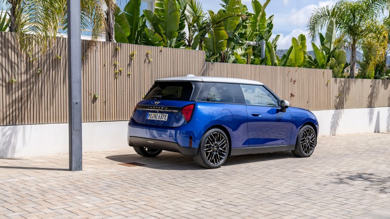 Phần đuôi xe của MINI 3-Cửa thuần điện mới cũng được nâng cấp, giúp xe thon gọn hơn. Logo MINI được in nổi đặt ở chính giữa đuôi xe, cản sau được ốp nhựa đen, tích hợp đèn phanh và đèn sương mù ở đuôi xe. Thiết kế đèn hậu là điểm nhấn với đồ hoạ Union Jack cách điệu trong khung hình tam giác vô cùng độc đáo. Cụm ăng-ten trên MINI 3-Cửa thuần điện cũng được thiết kế dạng vây cá mập, đây cũng được xem là một đặc điểm nhận diện cho các dòng xe điện của MINI. Xe sử dụng mâm có kích thước 18 inch kiểu Night Flash Spoke 2-tone. ".
